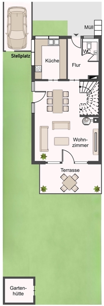 Die Küche ist vom Wohn-/Essbereich mit einer Schiebetür abgetrennt. Vor dem Wohnzimmer befindet sich die Süd-Terrasse mit dem Garten. Im Garten steht eine große Gartenhütte.