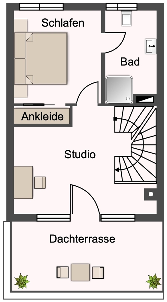 Im Dachgeschoss befinden sich das Elternschlafzimmer mit einer Ankleide, ein weiteres Bad mit Dusche, ein großer Raum (Studio) und die ca. 17,5 m² große Dachterrasse.